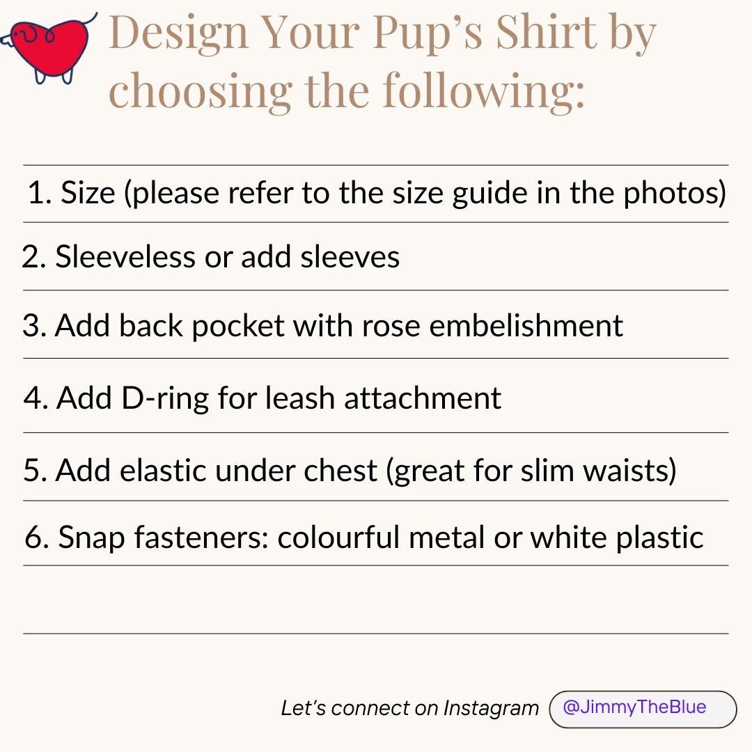 Each shirt is shaped carefully to your pup’s proportions. Custom touches are always welcome, simply add any notes or email tinycoats@yahoo.com